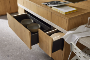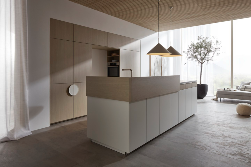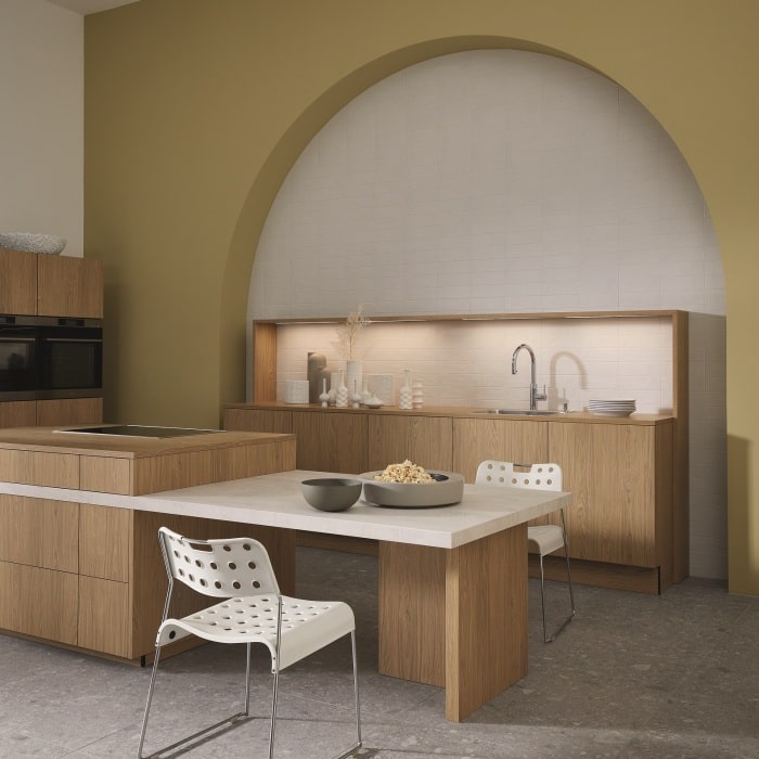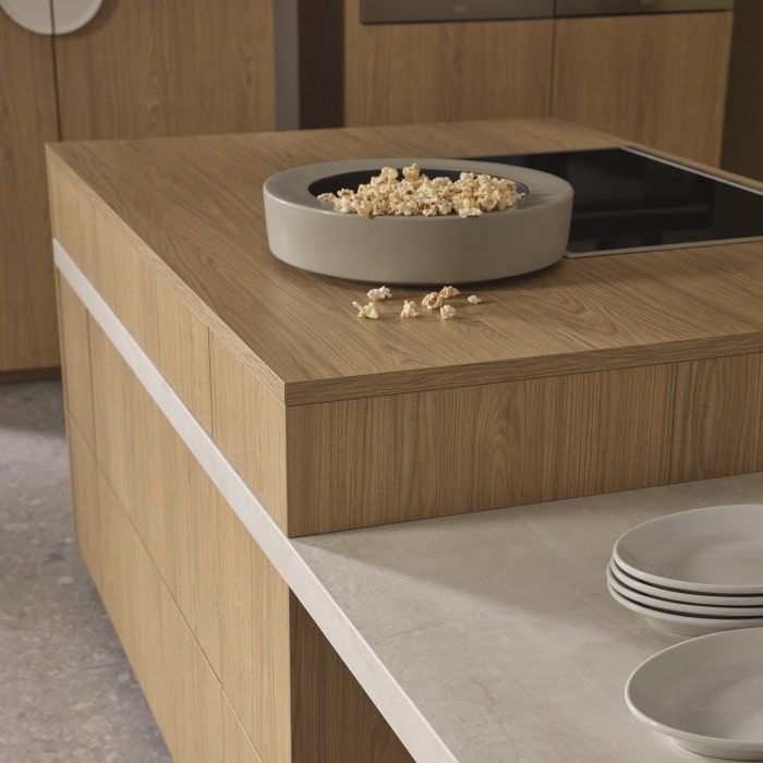De keukenlijn Leaf speelt met groene accenten die je letterlijk en figuurlijk dichter bij de natuur brengen. Denk aan geïntegreerde ruimtes voor kruidenplanten of mospanelen die niet alleen visueel aantrekkelijk zijn, maar ook bijdragen aan een betere luchtkwaliteit.